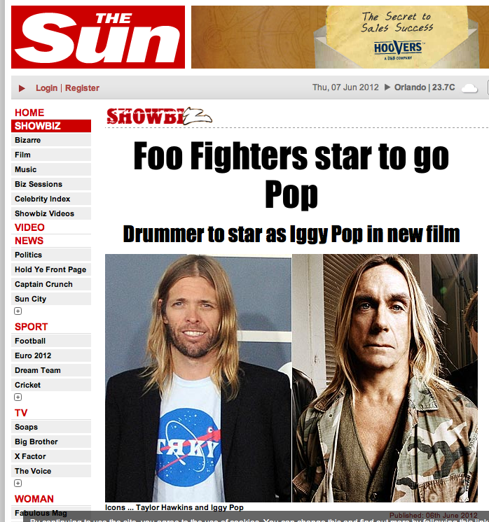 SCRAGGY-haired Foo Fighters star Taylor Hawkins will play rock icon Iggy Pop in an upcoming movie. (PS: Note the T-Shirt — Editor)