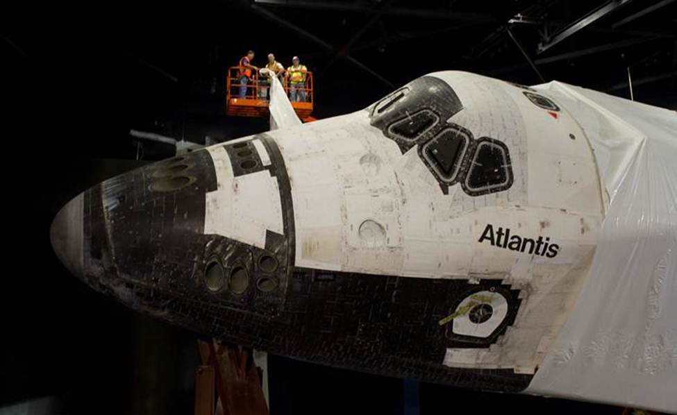 Atlantis is raised 30 feet off the ground and rotated at a 43.21 angle as if orbiting Earth. When the attraction opens June 29, guests will have an up-close, 360-degree view of Atlantis from several different levels — the wear and tear of its 33 missions apparent on its protective external tiles.
