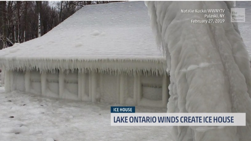 High waves and forceful winds turned a lakefront house into a block of ice on the shores of Lake Ontario in Ramona Beach, N.Y.